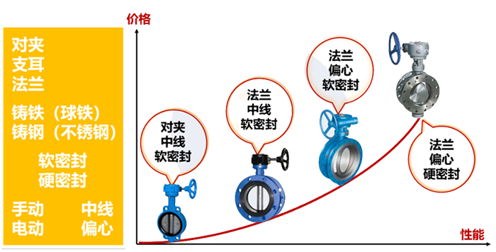 在性能和價格線圖中,我們可以看到閥門從對夾中線軟密封到法蘭偏心硬密封,在性能提高的同時,價格也是大幅的上漲。所以平時我們在確定蝶閥形式時,非必要工況應(yīng)當(dāng)最優(yōu)化選擇。