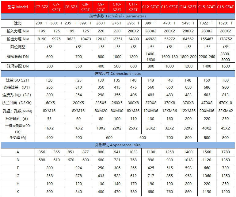 該系列是直齒輪箱與蝸輪箱對(duì)接組合成為二級(jí)傳動(dòng)蝸輪減速增壓機(jī)構(gòu),提高了機(jī)械總效率,輸入小力矩,開動(dòng)大閥門,使操作人員省力,每種型號(hào)提供多個(gè)傳動(dòng)比,能更好的匹配不同規(guī)格的閥門。
