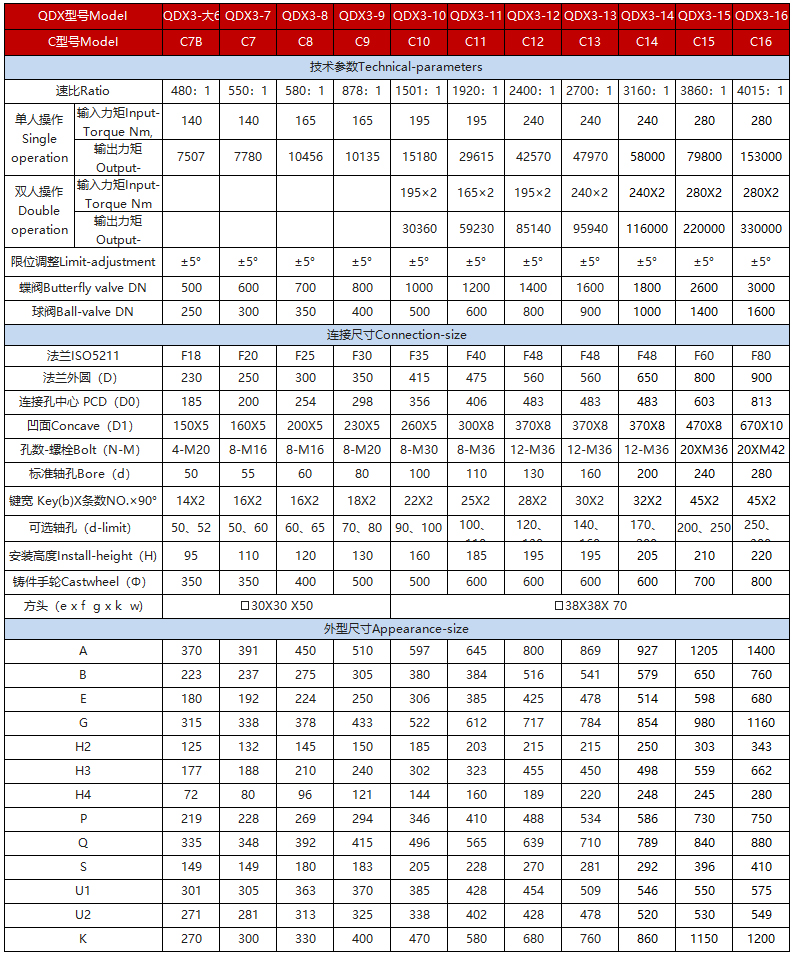 該系列是小蝸輪箱與大蝸輪箱對(duì)接組合成為二級(jí)傳動(dòng)蝸輪減速增壓機(jī)構(gòu),提高了機(jī)械總效率,輸入小力矩,開(kāi)動(dòng)大閥門,使操作人員省力,每種型號(hào)提供多個(gè)傳動(dòng)比,特殊型可輸出360°無(wú)限多回轉(zhuǎn),能更好的匹配不同規(guī)格的閥門。